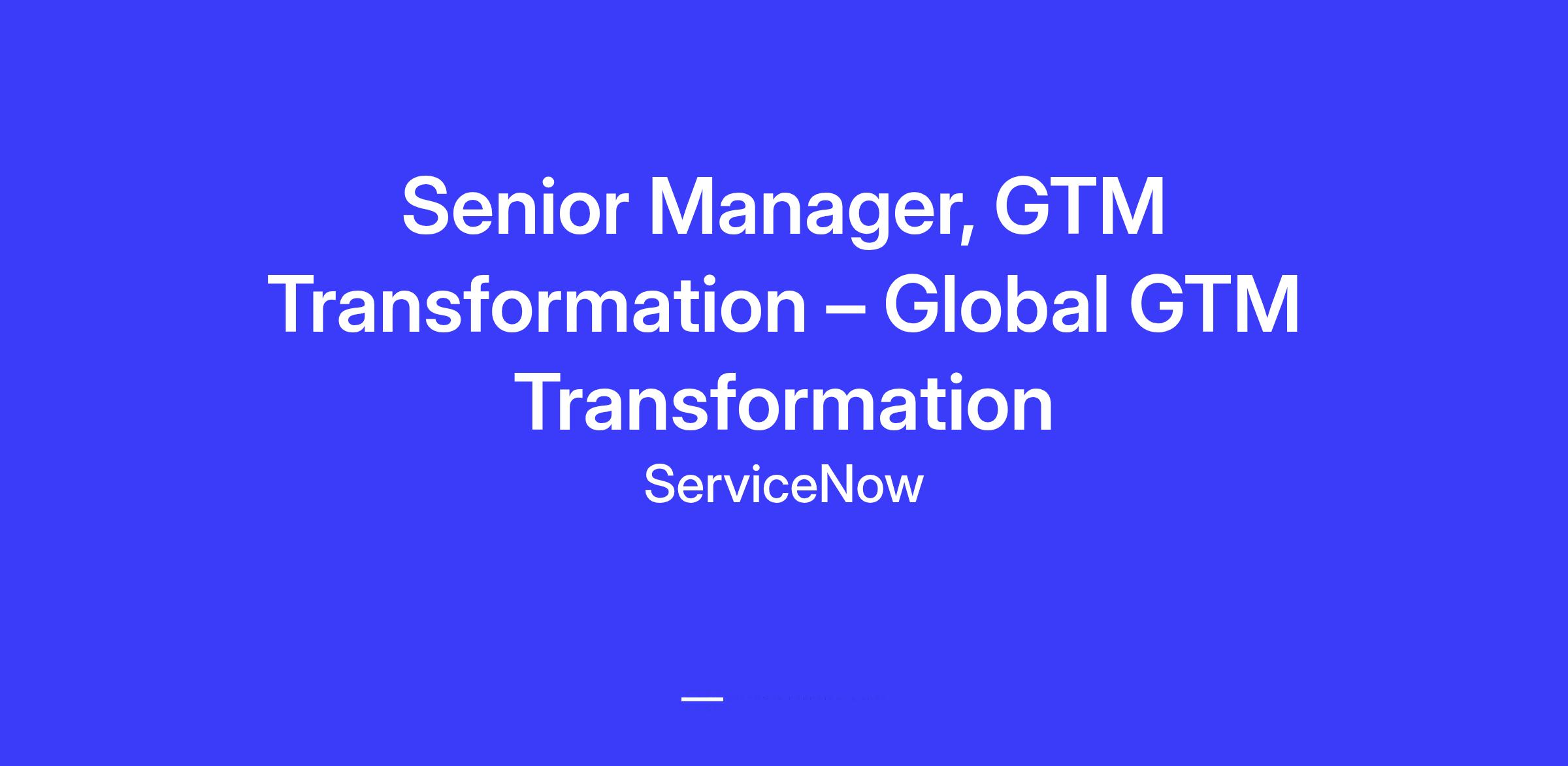 The Global GTM Transformation & M&A team at ServiceNow helps drive clarity, operational efficiency, and data-informed decision-making across our global Sales, Customer Success, and Partner ecosystem. As we continue to scale, we are seeking a Senior Manager, GTM Transformation, who can balance strategic thinking and analytical rigor with hands-on execution.
